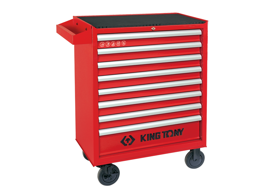 Sprawdź dostępnośćWózek warsztatowy King Tony z 8 szufladami. Szuflady łożyskowane z wygodnym uchwytem, ładowność wózka 360kg, malowany proszkowo, centralny zamek, jednoczęściowy stalowy korpus, góra zabezpieczona 10 mm matą gumową, przemysłowe kółka z hamulcem do podłogi TPR
