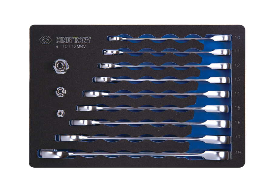 Komplet kluczy płasko-oczkowych z grzechotką jednokierunkową. Wkład piankowy pasujący do wózków warsztatowych King Tony. W zestawie znajdują się klucze 3731M w rozmiarach 10, 11, 12, 13, 14, 15, 16, 17, 19 oraz 3 uchwyty do nasadek, które umożliwiają zmianę odpowiednich kluczy z zestawu w proste grzechotki.