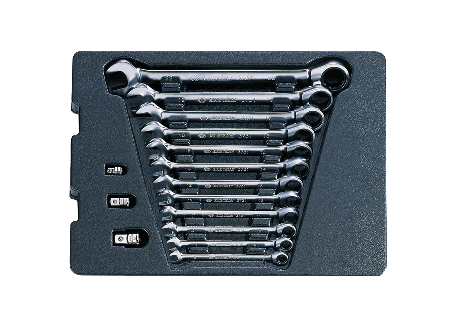 Komplet kluczy płasko-oczkowych z grzechotką jednokierunkową. . W zestawie znajdują się klucze w rozmiarach 8, 9, 10, 11, 12, 13, 14, 15, 16, 17, 19, 22 mm uchwyty do nasadek 1/4", 3/8" i 1/2" na klucze z grzechotką 10, 13, 19 mm