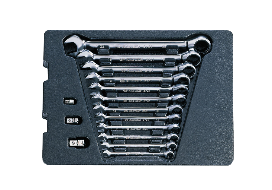 Komplet kluczy płasko-oczkowych z grzechotką dwukierunkową. Wkład pasujący do wózków warsztatowych King Tony. W zestawie znajdują się klucze w rozmiarach 8, 9, 10, 11, 12, 13, 14, 15, 16, 17, 19, 22 oraz trzema uchwytami do nasadek, które umożliwiają zmiane odpowiednich kluczy z zestawu w proste grzechotki.