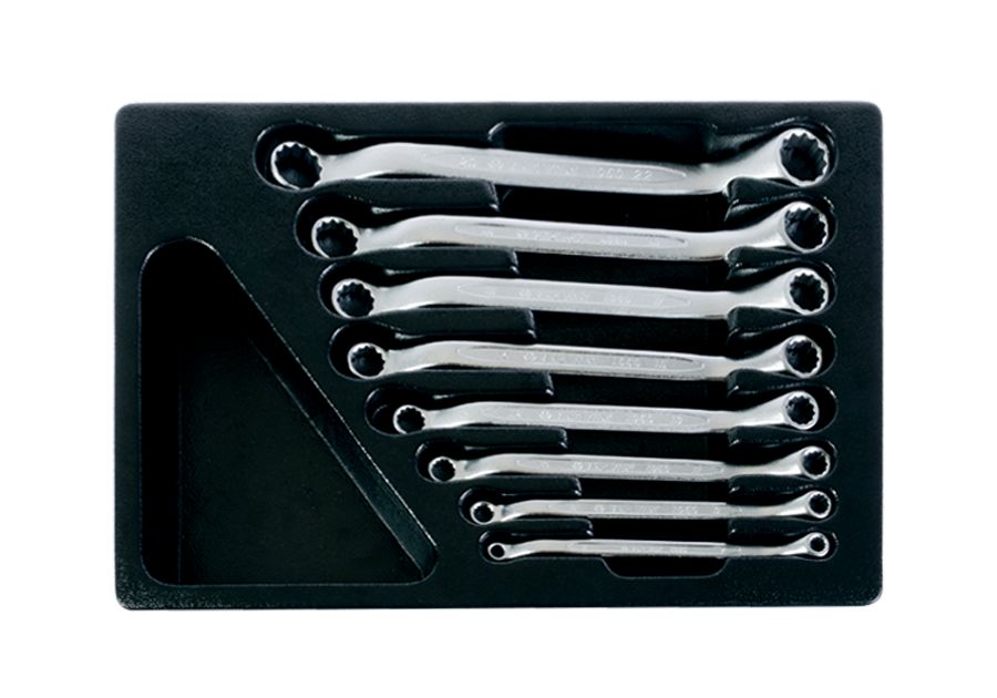 Komplet kluczy płasko-oczkowych King Tony w wytłoczce pasującej do wózków warsztatowych. W zestawie znajdują się klucze w rozmiarach 6x7, 8x9, 10x11, 12x13, 14x15, 16x17, 18x19, 20x22.
