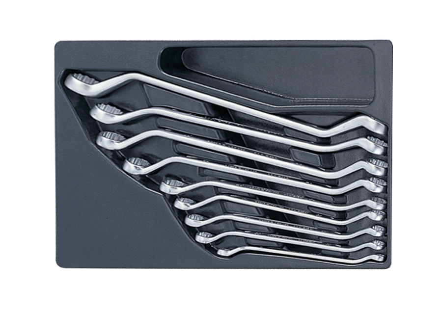 Komplet kluczy oczkowych odgiętych o 45 stopni pasujący do wózków narzędziowych King Tony. W zestawie znajduje się 9 kluczy w rozmiarach: 8 x 9, 10 x 12, 11 x 13, 12 x 14, 14 x 17, 17 x 19, 19 x 21, 22 x 24, 23 x 26.