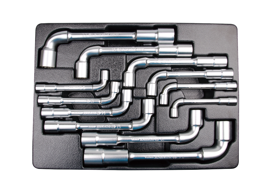 Komplet kluczy fajkowych King Tony w wytłoczce pasującej do wózków warsztatowych. W zestawie znajdują się klucze w rozmiarach 8, 10, 11, 12, 13, 14, 16, 17, 18, 19, 22, 24.