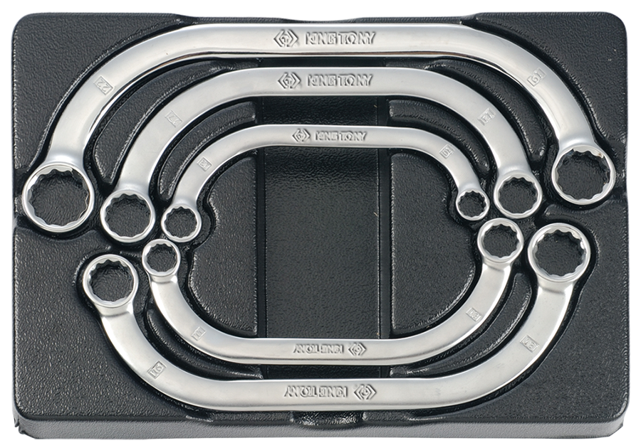 Komplet pięciu kluczy oczkowych odgiętych w wytłoczce do wózka warsztatowego King Tony. W zestawie znajdują się klucze o rozmiarach 10x12, 11x13, 14x17, 16x18, 19x22