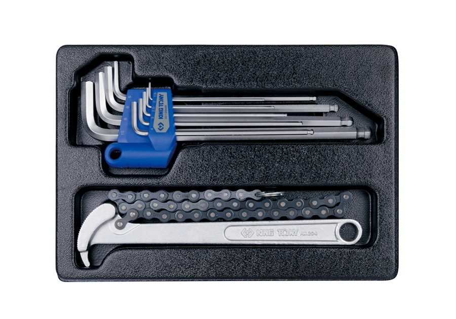 W skład zestawu wchodzą imbusy w rozmiarach: 1,5, 2, 2,5, 3, 4, 5, 6, 8, 10 mm oraz klucz do filtra oleju, długość całkowita 223 mm, obwód 60-140 mm