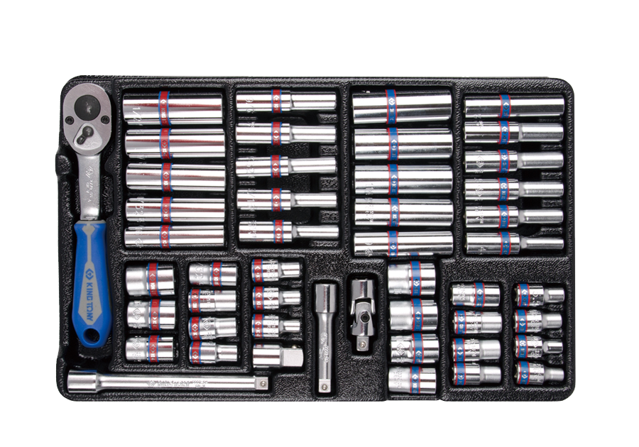 Komplet narzędzi 1/4" King Tony we wkładzie pasującym do wózków warsztatowych. W zestawie znajdują się nasadki 6-kątne długie w rozmiarach metrycznych: 4, 5, 5.5, 6, 7, 8, 9, 10, 11, 12, 13 oraz calowych 5/32", 3/16", 7/32", 1/4", 9/32", 5/16", 11/32", 3/8", 7/16", 1/2", nasadki krótkie 6-kątne w rozmiarach metrycznych: 4, 4.5, 5, 5.5, 6, 7, 8, 9, 10, 11, 12, 13 oraz calowych 5/32", 3/16", 7/32", 1/4", 9/32", 5/16", 11/32", 3/8", 7/16", 1/2", przegub Kardana, redukcja na 3/8", dwie chromowane przedłużki oraz grzechotka z gumową rączką.