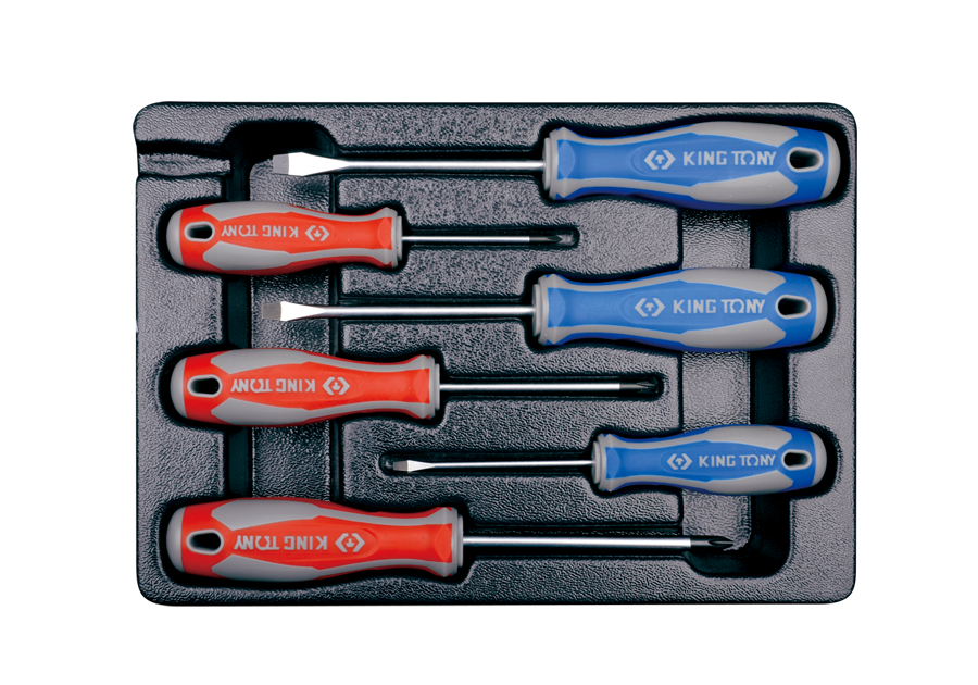 Komplet sześciu wkrętaków King Tony we wkładzie do wózka narzędziowego. W zestawie znajdują się śrubokręty krzyżakowe No.0x60, No.1x80, No.2x100 oraz płaskie 3x75, 5.5x100, 6.5x150