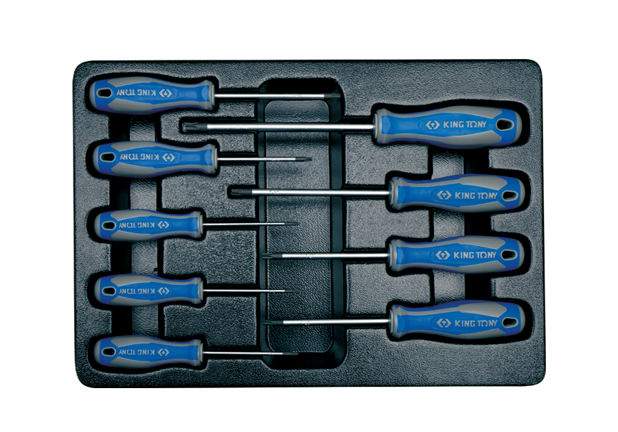 Komplet wkrętaków z końcówką torx King Tony we wkładzie do wózka warsztatowego. Zestaw składa się z 9 śrubokrętów w rozmiarach T8, T9, T10, T15 (75mm długości), T20, T25, T27 (100mm długości), T30x125 oraz T40x150