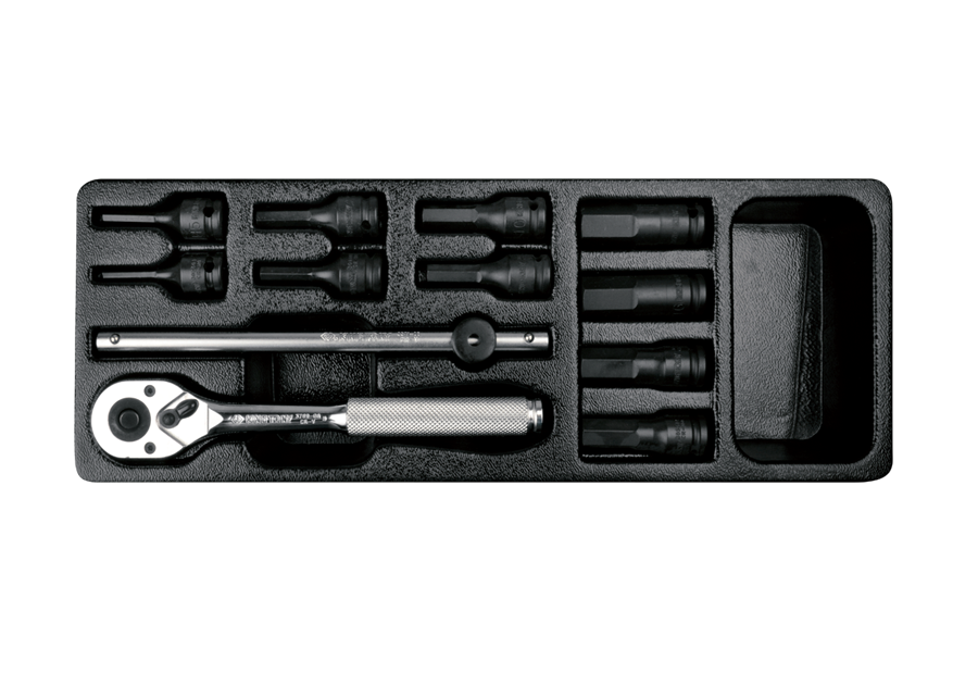 • ZESTAW NASADEK UDAROWYCH 3/8"  12cz.  KRÓTKIE HEX H4-H17  Z  AKCESORIAMI, CHROM, WKŁAD DO WÓZKA