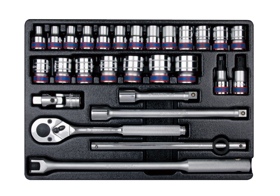 Zestaw narzędzi 1/2" King Tony we wkładzie do wózków warsztatowych. W zestawie znajdują się nasadki 1/2", krótkie, 6-kątne w rozmiarach 8, 9, 10, 11, 12, 13, 14, 15, 16, 17, 18, 19, 20, 21, 22, 23, 24, 27, 29, 32, nasadki z końcówką Torx T55 i T60, przegub Kardana, grzechotka z moletowanym uchwytem, dwie przedłużki, pokrętło łamane oraz pokrętło przesuwne
