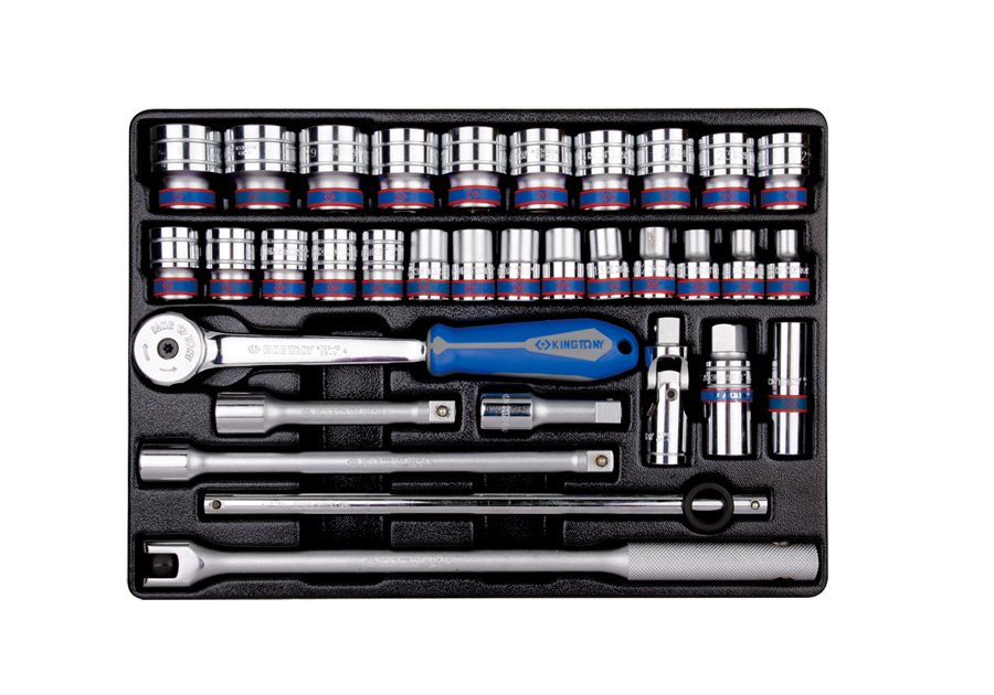 Komplet narzędzi 1/2" we wkładzie do wózka narzędziowego. W zestawie znajdują się nasadki krótkie, 6-kątne 8, 9, 10, 11, 12, 13, 14, 15, 16, 17, 18, 19, 20, 21, 22, 23, 24, 25, 26, 27, 28, 29, 30, 32, dwie 6-kątne nasadki do świec, przegub Kardana, trzy przedłużki, pokrętło łamane, pokrętło przesuwne oraz grzechotka z gumową rączką