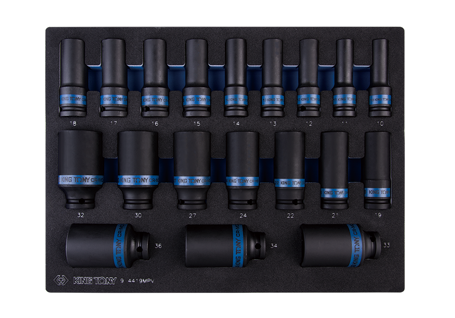 • KPL. NASADEK UDAROWYCH 1/2"  19 cz. DŁUGIE 6-KĄT, 10 - 36mm, WKŁAD Z PIANKI DO WÓZKA