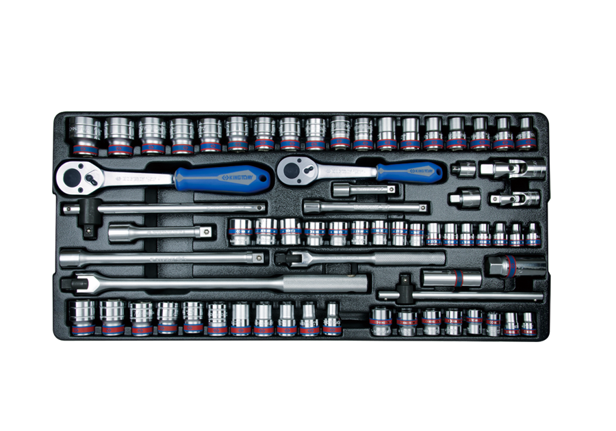 Komplet narzędzi 3/8" oraz 1/2" King Tony w wersjach metrycznych oraz calowych. Nasadki dostępne w zestawie to: krótkie, 3/8", 12-kątne, metryczne: 6, 7, 8, 9, 10, 11, 12, 13, 14, 15, 16, 17, 19, 20, 21, 22, calowe 3/8", 7/16", 1/2", 9/16", 5/8", 11/16", 3/4", 13/16", krótkie, 1/2", 12-kątne, metryczne 10, 11, 12, 13, 14, 15, 16, 17, 18, 19, 20, 21, 22, 23, 24, 27, 30, 32 oraz calowe 3/8", 7/16", 1/2", 9/16", 5/8", 11/16", 3/4", 13/16", 7/8", 15/16", 1" oraz dwie nasadki do świec 6-kątne 21mm i 16mm. Oprócz nasadek w zestawie znajdują się inne narzędzia i akcesoria takie jak: przeguby Kardana 3/8" i 1/2", redukcja 3/8" -> 1/4" i 1/2" -> 3/8", pokrętło przesuwne 3/8" i 1/2", dwie przedłużki 3/8" oraz dwie 1/2", pokrętła przesuwne 3/8" i 1/2", piła do metalu oraz grzechotki z gumową rączką: 3/8" oraz 1/2". Cały zestaw w blistrze pasującym do wózka warsztatowego.