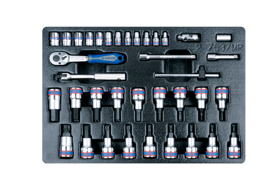 • KPL. NASADEK 1/4" + 1/2" 37cz. KRÓTKIE 6-kąt. 4 - 13mm, TORX T20 - T60, HEX H3 - H14, Z AKCESORIAMI, CHROM, WKŁAD DO WÓZKA