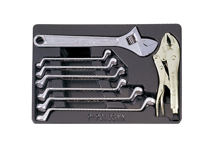 Zestaw kluczy oczkowych odgiętych wraz z kluczem nastawnym oraz szczypcami typu "mors". Zestaw we wkładzie do wózka warsztatowego zawiera klucze oczkowe o rozmiarach 8x10, 10x12, 11x13, 12x14, 14x17, 17x19.