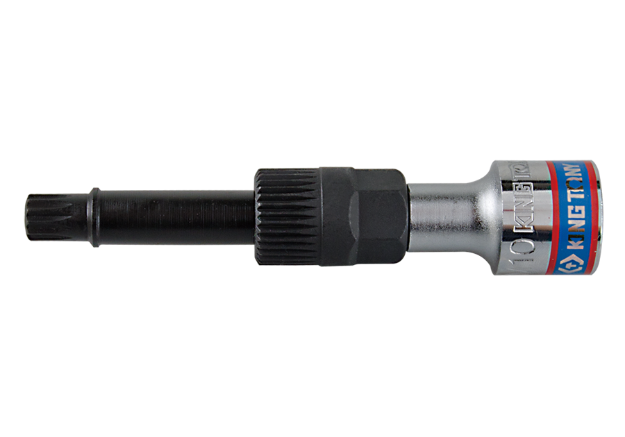 Klucz do alternatora - nasadka specjalna z bitem SPLINE M10, przeznaczona do montażu i demontażu koła pasowego alternatora (tzw. sprzęgiełko). Blokada alternatora następuje przy użyciu nasadki z bitem SPLINE M10 a przekręcenie koła za pomocą nakrętki wielozębnej (33 zęby) z sześciokątem dla klucza 19 mm umiejscowionej na trzpieniu narzędzia. Klucz przeznaczony jest dla alternatorów marki Bosch, Valeo, Magetic Marelli, Denso itd. Znajduje zastosowanie przy pracach serwisowych z autami marek VW, Citroen/Peugeot, Mercedes, Renault, BMW, Ford, Fiat, Toyota itd.