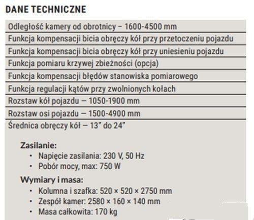 - ciągły pomiar wszystkich kątów poziomych i pionowych - razem 32 parametry geometrii ustawienia kół