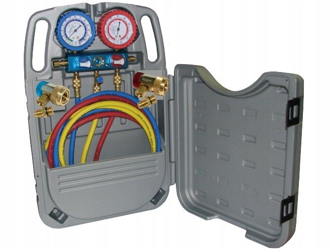 Komplet manometrów z przyłączami do kontroli parametrów oraz szczelności układów klimatyzacji. Manometry obsługują układy klimatyzacji na nowy czynnik chłodniczy R1234YF. Całość zapakowana w wygodnej, estetycznej walizce.