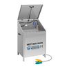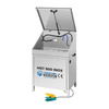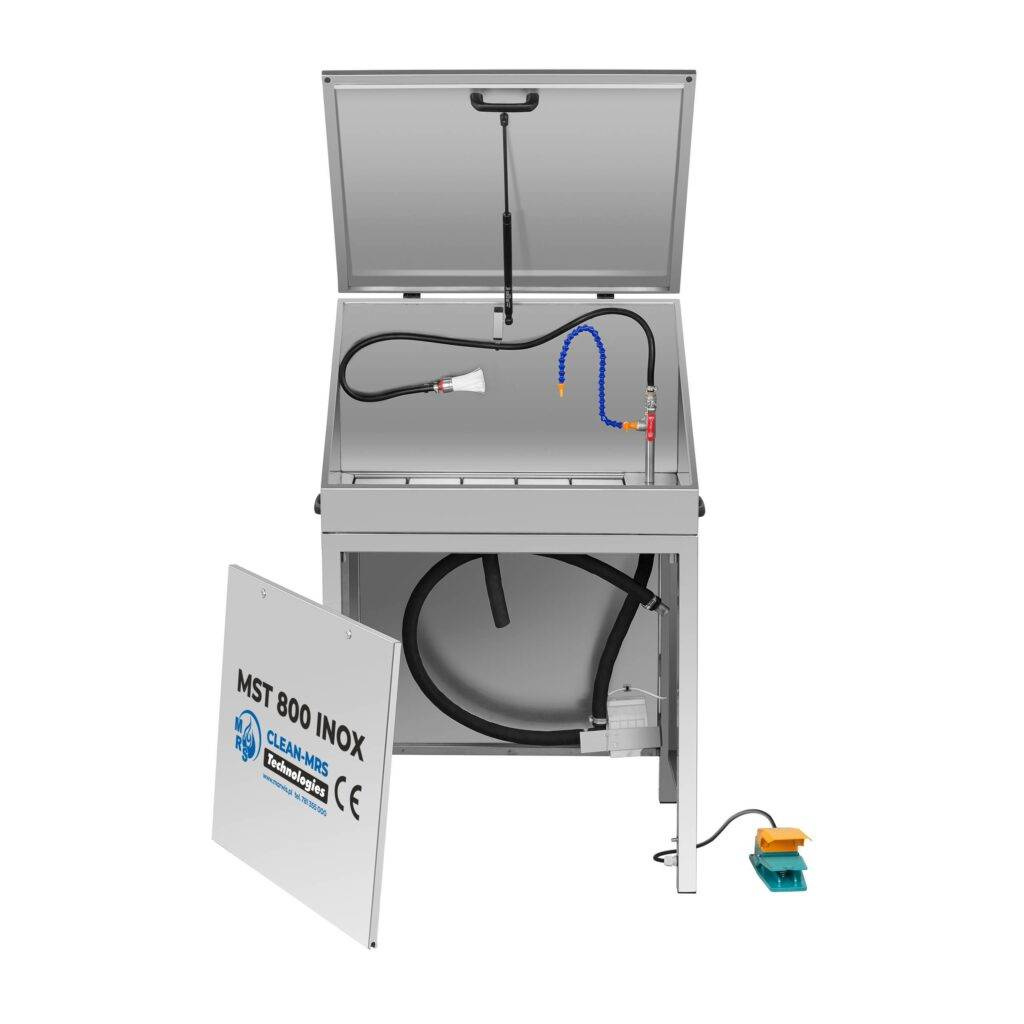 Działanie myjek stacjonarnych typu MST 800 polega na usuwaniu tłustych zanieczyszczeń z wyrobów przy użyciu pędzla przepływowego, przez który przepływa ciecz myjąca. Zalecany płyn ?Clean Professional?. Posiada on szczególne właściwości myjąco-odtłuszczające, zgodne z kartą charakterystyki tego płynu. Przedmiot podlegający myciu układany jest na perforowanym blacie roboczym, pod którym umiejscowiona jest wanna ociekowa. Przepływająca przez pędzel ciecz, rozpuszcza i zmywa tłuste zanieczyszczenia zalegające na wyrobie podlegającym myciu. Ciężkie zanieczyszczenia stałe opadają grawitacyjnie na specjalne uformowane dno wanny. Lżejsze związki olejo-pochodne spływają razem z cieczą myjącą do beczki, pod blatem roboczym. Na dnie beczki osadzają się związki cięższe, a płyn myjący (jako lżejszy) powraca do obiegu. Przepływ płynu przez pędzel wymuszany jest przez pompę ssąco-tłoczącą. Wielkość przepływu cieczy przez pędzel podlega ręcznej regulacji na zaworze przepływowym.
