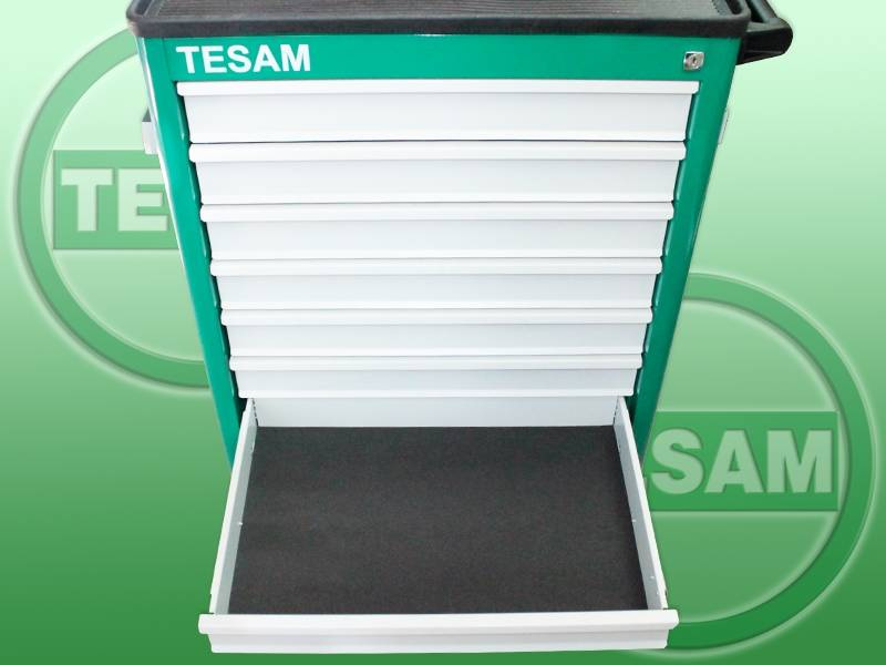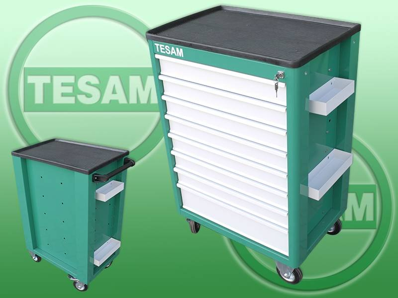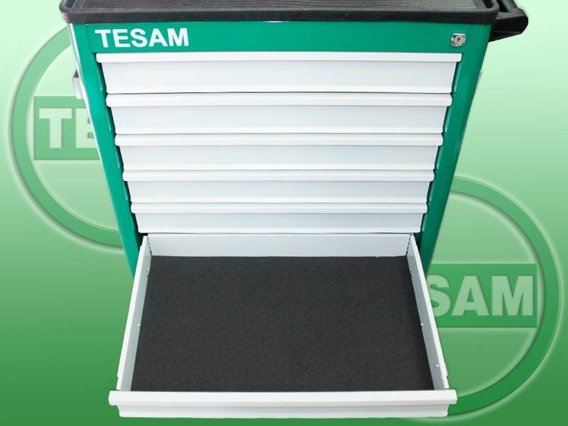 Produkt zapakowany w wózek metalowy na kółkach, wyposażony w 6 szuflad.