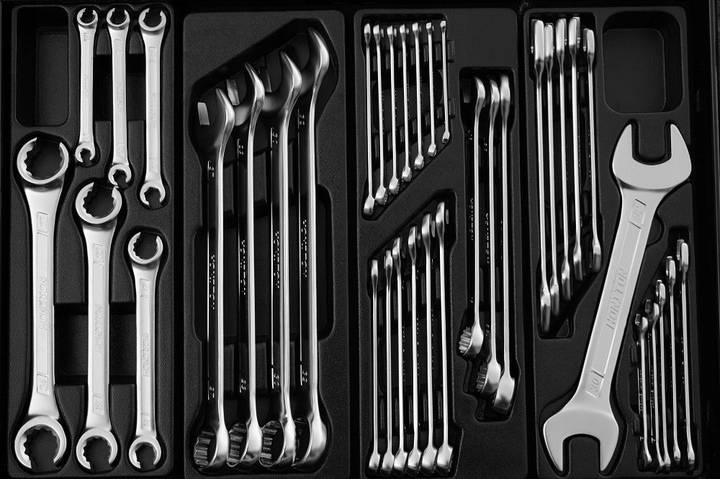- Klucze płaskie: 6x7, 8x9, 10x11, 12x13, 14x15, 16x17, 18x19, 20x22, 21x23, 24x27, 30x32mm