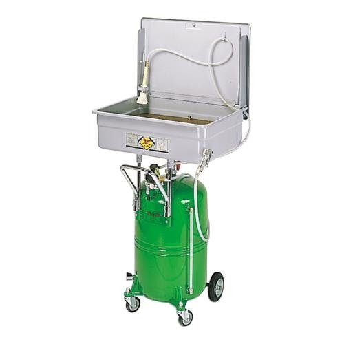 Pneumatyczna myjka do części mechanicznych z wanną 50 l na zbiorniku na kołach o pojemności 65 l. Wyposażona w pędzel i pistolet do przedmuchiwania. Możliwość mycia pędzlem przy ciągłym przepływie płynu, lub metodą zanurzeniową - elementy myte są zanurzone w płynie bezpośrednio w wannie i poddawane płukaniu.