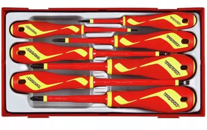 - zestaw zawierający 7 izolowanych wkrętaków (płaskich oraz krzyżowych Phillips i Pozidriv), wykonanych zgodnie z normą IEC 60900 do prac pod napięciem do 1000 V (przez specjalnie przeszkolony personel)