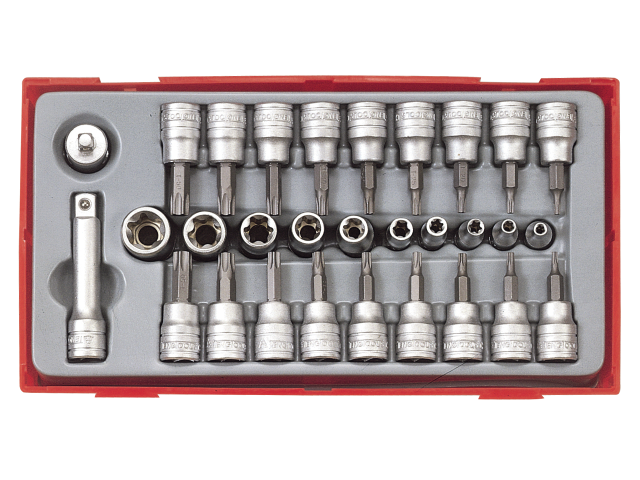 Zawartość | Przedłużacz, długość 75 mm Łącznik redukcyjny czopa, 3/8-1/4 cala Nasadki TX-E 1/4 cala - E4 5 6 7 8 Nasadki TX-E 3/8 cala - E10 12 14 16 18 Nasadki TX 1/4 cala - TXP 10 15 20 25 27 30 40 50 Nasadki TX 3/8 cala - TX10 15 20 25 27 30 40 45 50 |