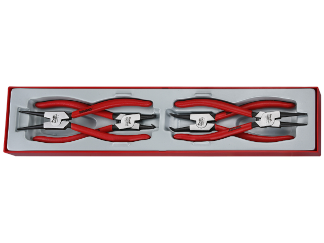 Teng Tools Zestaw składający się z 4 szczypiec do pierścieni osadczych (2 proste i 2 odgięte, do pierścieni wewn. i zewn.) Szczypce wyposażone w sprężynę powrotną.