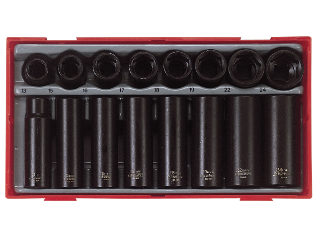 Zawartość | Nasadki maszynowe (krótkie) 13, 15, 16, 17, 18, 19, 22, 24 mm Nasadki maszynowe (długie) 13, 15, 16, 17, 18, 19, 22, 24 mm |