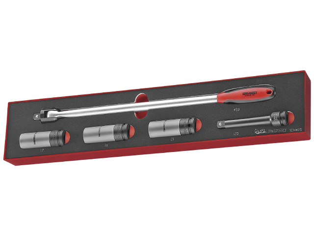 Zawartość | Przedłużacz 1/2", długość 125 mm Nasadki do śrub do kół 1/2" 17, 19, 21 mm Pokrętło przegubowe 1/2", długość 425 mm |