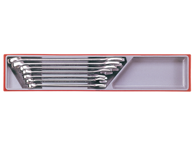 Teng Tools Składa się z 7 kluczy płasko-oczkowych o rozmiarach metrycznych. Ze stali chromowo-wanadowej. Ten sam rozmiar na obu końcach. Główka pierścieniowa dwunastokątna, odgięta pod kątem 15°. Główki szlifowane. Chromowane.