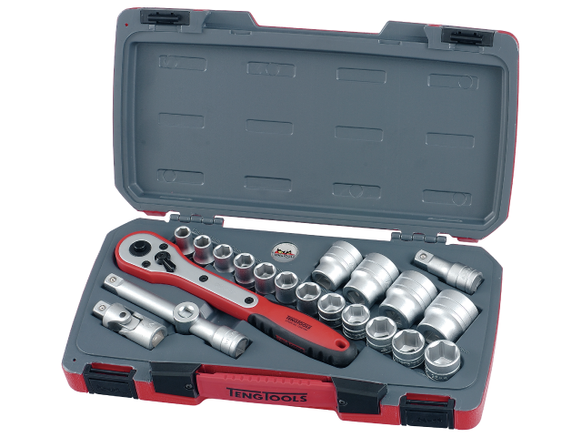 Zestaw składający się z 21 elementów. Zawiera nasadki dwunastokątne lub, odpowiednio, sześciokątne. Zawartość: 2 przedłużacze (63 i 150 mm), przegub uniwersalny, łącznik redukcyjny 1/2"- 3/8" oraz zbrojone włóknem szklanym pokrętło zapadkowe o działaniu dwukierunkowym.