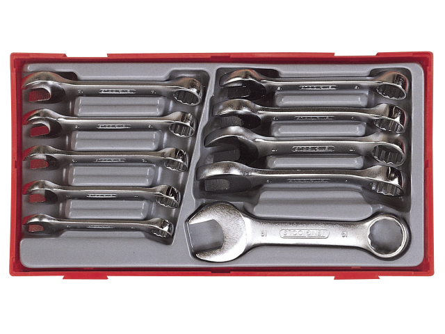 Sprawdź dostępnośćTeng Tools Model "Stubby". Krótkie klucze ze stali chromowo-wanadowej. Ten sam rozmiar na obu końcach. Dwunastokątna główka oczkowa jest odgięta o 15°. Chromowane.