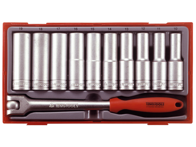 Sprawdź dostępnośćTeng Tools Zestaw składający się z 10 nasadek dwunastokątnych z chwytem kwadratowym 1/2" oraz pokrętła przegubowego.