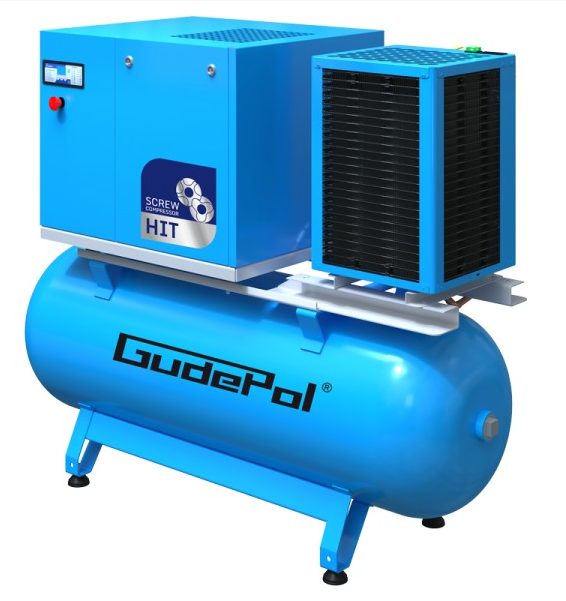 Sprężarka śrubowa GUDEPOL serii HIT-3G to kompleksowe rozwiązanie w postaci źródła sprężonego powietrza w firmie, skonstruowane w oparciu o najnowocześniejsze technologie światowe powiązane z najwyższą jakością materiałów. Kompresor HIT-3G wyposażony jest w panel mikroprocesorowy układu sterowania co jest nowością w kompresorach tej klasy. Rozwiązanie to pozwala na łatwą i czytelną pracę urządzenia. Układ automatycznie wyłapuje nieprawidłowości pracy i informuje, wyświetlając rodzaj usterki, a w przypadku zagrożenia uszkodzenia sprężarki, wyłączy ją.