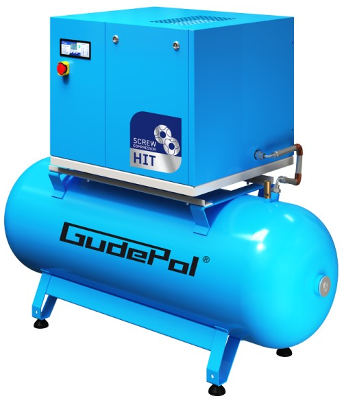 Sprężarka śrubowa GUDEPOL serii HIT to kompleksowe rozwiązanie w postaci źródła sprężonego powietrza w firmie, skonstruowane w oparciu o najnowocześniejsze technologie światowe powiązane z najwyższą jakością materiałów. Kompresor HIT wyposażony jest w panel mikroprocesorowy układu sterowania co jest nowością w kompresorach tej klasy. Rozwiązanie to pozwala na łatwą i czytelną pracę urządzenia. Układ automatycznie wyłapuje nieprawidłowości pracy i informuje, wyświetlając rodzaj usterki, a w przypadku zagrożenia uszkodzenia sprężarki, wyłączy ją.