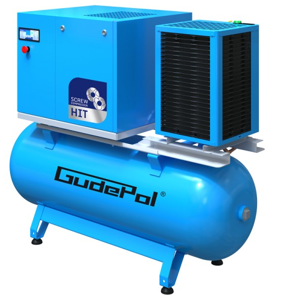 Sprężarka śrubowa GUDEPOL serii HIT to kompleksowe rozwiązanie w postaci źródła sprężonego powietrza w firmie, skonstruowane w oparciu o najnowocześniejsze technologie światowe powiązane z najwyższą jakością materiałów. Kompresor HIT wyposażony jest w panel mikroprocesorowy układu sterowania co jest nowością w kompresorach tej klasy. Rozwiązanie to pozwala na łatwą i czytelną pracę urządzenia. Układ automatycznie wyłapuje nieprawidłowości pracy i informuje, wyświetlając rodzaj usterki, a w przypadku zagrożenia uszkodzenia sprężarki, wyłączy ją.