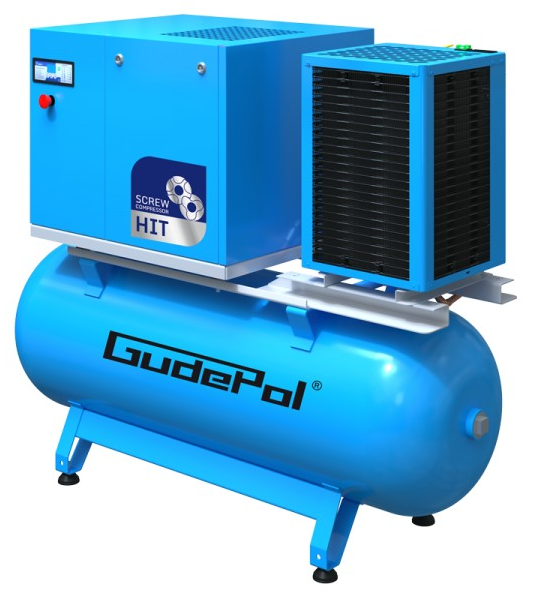 Sprężarka śrubowa GUDEPOL serii HIT to kompleksowe rozwiązanie w postaci źródła sprężonego powietrza w firmie, skonstruowane w oparciu o najnowocześniejsze technologie światowe powiązane z najwyższą jakością materiałów. Kompresor HIT wyposażony jest w panel mikroprocesorowy układu sterowania co jest nowością w kompresorach tej klasy. Rozwiązanie to pozwala na łatwą i czytelną pracę urządzenia. Układ automatycznie wyłapuje nieprawidłowości pracy i informuje, wyświetlając rodzaj usterki, a w przypadku zagrożenia uszkodzenia sprężarki, wyłączy ją.