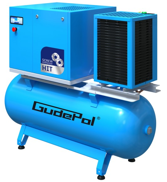 Sprężarka śrubowa GUDEPOL serii HIT-3G to kompleksowe rozwiązanie w postaci źródła sprężonego powietrza w firmie, skonstruowane w oparciu o najnowocześniejsze technologie światowe powiązane z najwyższą jakością materiałów. Kompresor HIT-3G wyposażony jest w panel mikroprocesorowy układu sterowania co jest nowością w kompresorach tej klasy. Rozwiązanie to pozwala na łatwą i czytelną pracę urządzenia. Układ automatycznie wyłapuje nieprawidłowości pracy i informuje, wyświetlając rodzaj usterki, a w przypadku zagrożenia uszkodzenia sprężarki, wyłączy ją.