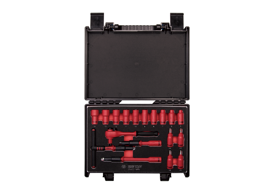 ZESTAW NASADEK IZOLOWANYCH 1/4" 18cz. KRÓTKIE, 6-kąt. 5 - 14mm, Z AKCESORIAMI, CHROM, KASETA Z TWORZYWA
