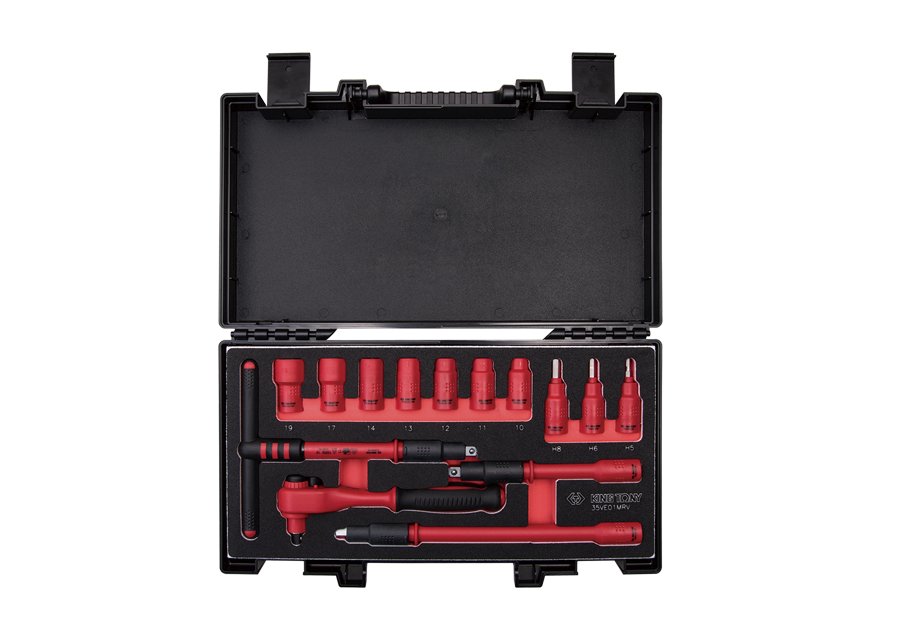 ZESTAW NASADEK IZOLOWANYCH 3/8" 14cz. KRÓTKIE, 6-kąt. 10 - 19mm, Z AKCESORIAMI, CHROM, KASETA Z TWORZYWA