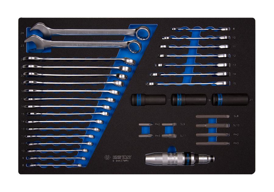 • ZESTAW KLUCZY PŁASKO-OCZKOWYCH + WKRĘTAK UDAROWY + BITY + NASADKI 37cz., WKŁAD Z PIANKI EVA DO WÓZKA