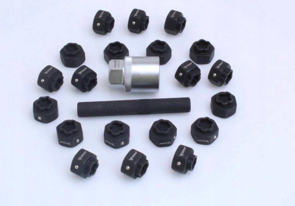 Adaptor wymiennych nasadek do śrub zabezpieczających kół ze względu na bezpieczeństwo użytkowania i trwałość nie może być obciążany urządzeniami z napędem udarowym.