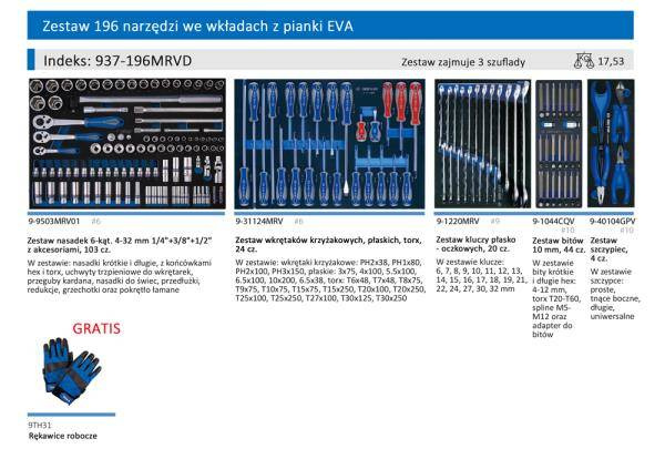 Moduł 1: nasadki długie 6-kątne 1/4" w rozmiarach 4, 4.5, 5, 5.5, 6, 7, 8, 9, 10, 11, 12, 13 mm, nasadki krótkie 6-kątne 1/4" w rozmiarach 4, 4.5, 5, 5.5, 6, 7, 8, 9, 10, 11, 12, 13 mm, nasadki z bitem TORX 3/8" o długości 50 mm: T10, T15, T20, T25, T27, T30, T40, T45, T50, nasadki z bitem HEX 3/8" o długości 50 mm: H3, H4, H5, H6, H8, H10, H12, nasadki długie 6-kątne 3/8" w rozmiarach 10, 12, 13, 14, 15, 16, 17, 18, 19, 21 mm, nasadki krótkie 6-kątne 3/8" w rozmiarach 8, 10, 11, 12, 13, 14, 15, 16, 17, 18, 19, 20, 21, 22 mm, nasadki do świec 6-kątne 3/8" w rozmiarach 16, 21 mm, nasadka do świec 12-kątna 3/8" 14 mm, nasadki krótkie 6-kątne 1/2" w rozmiarach 10, 12, 13, 14, 15, 16, 17, 18, 19, 20, 21, 22, 23, 24, 27, 28, 30, 32 mm, grzechotka 1/4" z przyciskiem zwalniającym 24 zęby, grzechotka 1/4" z przyciskiem zwalniającym 32 zęby, grzechotka 1/4" z przyciskiem zwalniającym 32 zęby, przedłużki 1/4" 54, 100 mm, 3/8" 75, 250 mm, 1/2" 125, 250 mm, przegub kardana 1/4", 3/8", 1/2", pokrętło łamane 1/2", adapter 1/4" na 3/8", redukcje 3/8" na 1/4" oraz 1/2" na 3/8", uchwyt trzpieniowy do wkrętarek 1/4" na nasadki 1/4" oraz 3/8", długość 50 mm. (moduł 9-9503MRV01)