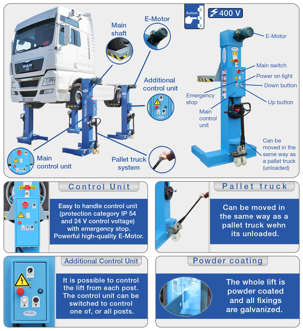 Przeznaczony do podnoszenia samochodów ciężarowych i pojazdów specjalistycznych. Wersję 4 można w dowolnym momencie zaktualizować do wersji 6. Odległość od środka mocowania koła do kolumny podnośnika 361 mm dla TW575.