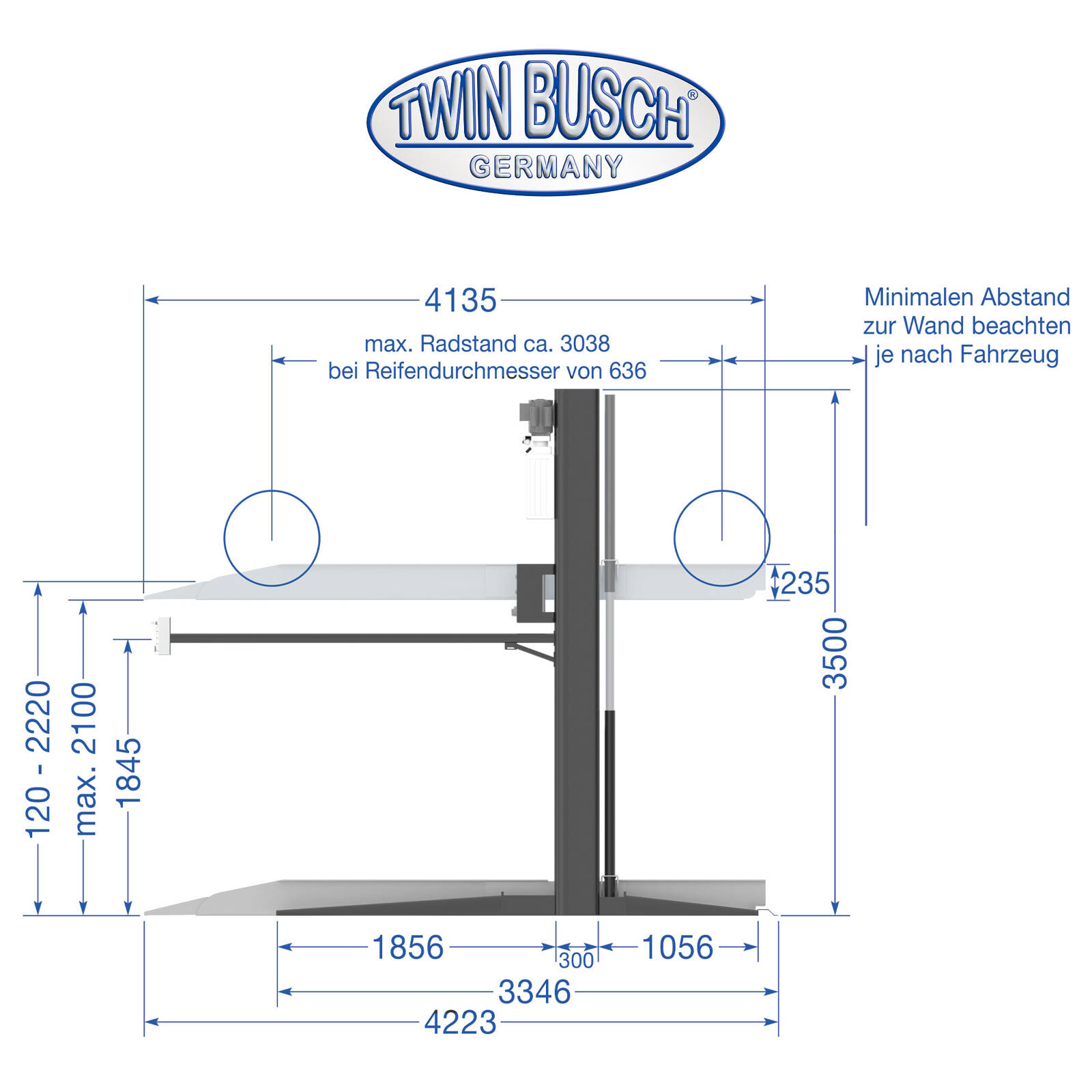 Praktyczny podnośnik parkingowy z 2 kolumnami i automatycznym odblokowaniem.Ze względu na konstrukcję 2 kolumn wymagana jest mniejsza powierzchnia, dzięki czemu podnośnik idealnie nadaje się do pomieszczeń o ograniczonej przestrzeni. Ponadto podnośniki typu TW 227 P można ustawiać jeden obok drugiego (w dowolnej liczbie). Pozwala to na lepsze gospodarowanie przestrzenią.Zespół sterujący z przodu zapewnia wygodne podnoszenie i opuszczanie platformy parkingowej .Dzięki bardzo dużej wysokości podnoszenia2100 mm i udźwigu2700 kg podnośnik jest również imponująco dobry do wysokich i cięższych pojazdów, takich jak duży SUV, minibus lub VW T6.Dzięki solidnie zbudowanej i zabezpieczonej (ocynkowanej) platformie pojazd poniżej jest chroniony przed olejem i brudem.