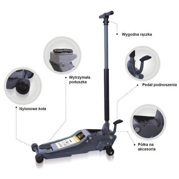Podnośnik hydrauliczny "żaba" z profesjonalną przegrodą na akcesoria. Posiada podwójną pompę hydrauliczną zwiększającą prędkość podnoszenia oraz pedał sterowania nożnego.