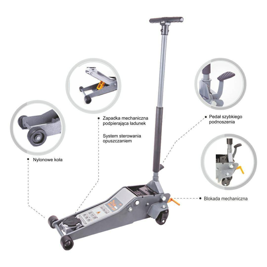 Podnośnik posiada przegrodą na akcesoria. Został wyposażony jest w podwójną pompę zwiększającą prędkość podnoszenia pedał szybkiego podnoszenia.