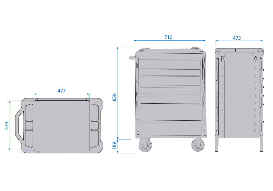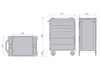 Wymiary szuflad: 5 x 570 x 380 x 70 mm. Wymiary szuflad: 2 x 570 x 380 x 150 mm. Wymiary kółek: 5” x 2”. Waga wózka: 68 kg.